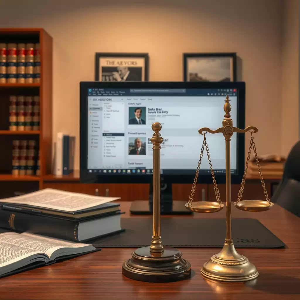 A professional office scene featuring law books, a computer displaying legal records, and a balanced scale of justice, with warm lighting that conveys trust and diligence in verifying a DUI lawyer.